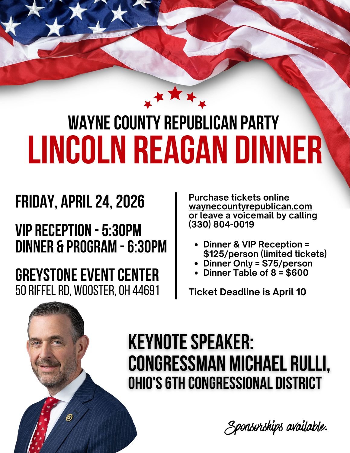 Greystone Event Center 50 Riffel Road, Wooster, OH, United StatesWayne County Republican Party is having its Lincoln-Reagan Dinner with special guest speaker Congressman Michael Rulli. Save the date, purchase tickets online at waynecountyrepublican.com or call 330-804-0019. Ticket deadline is April 10th!