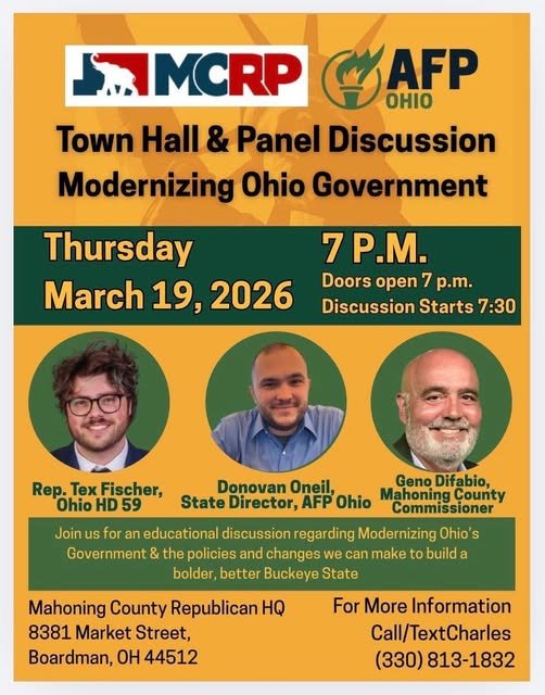 Mar 19 7:00 pm - 8:30 pm Town Hall & Panel Discussion On “Modernizing Ohio Government” Mahoning County Republican HQ 8381 Market Street, Boardman Event Details Get Directions