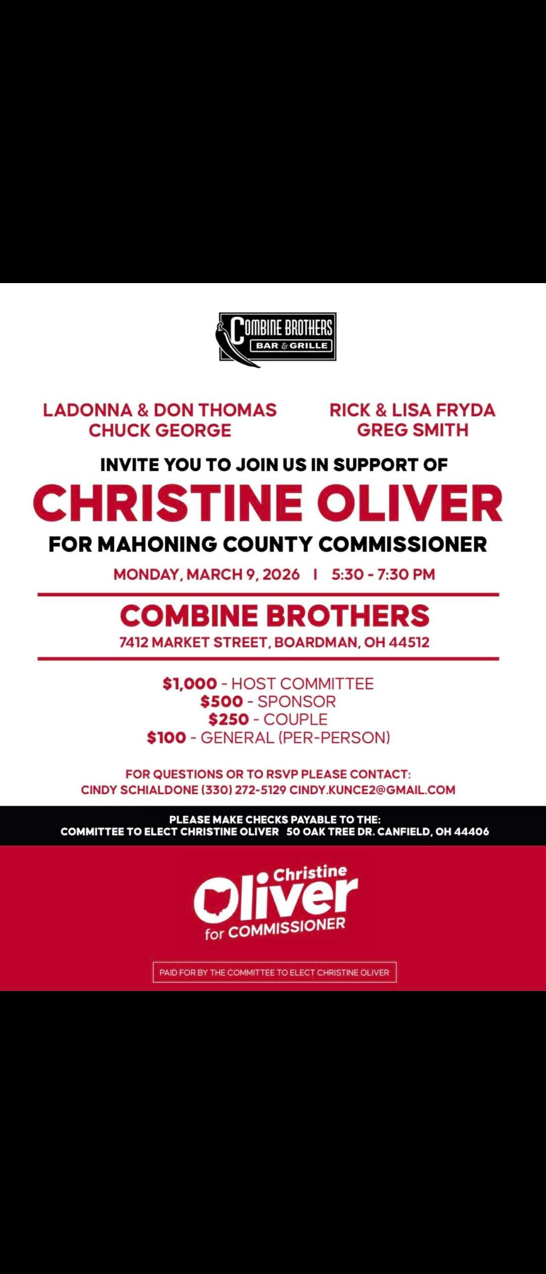 Combine Brothers 7412 Market Street, Boardman, OH, United StatesJoin Us! In support with Mahoning County Republican Party to support Christine Oliver for Mahoning County Commissioner!